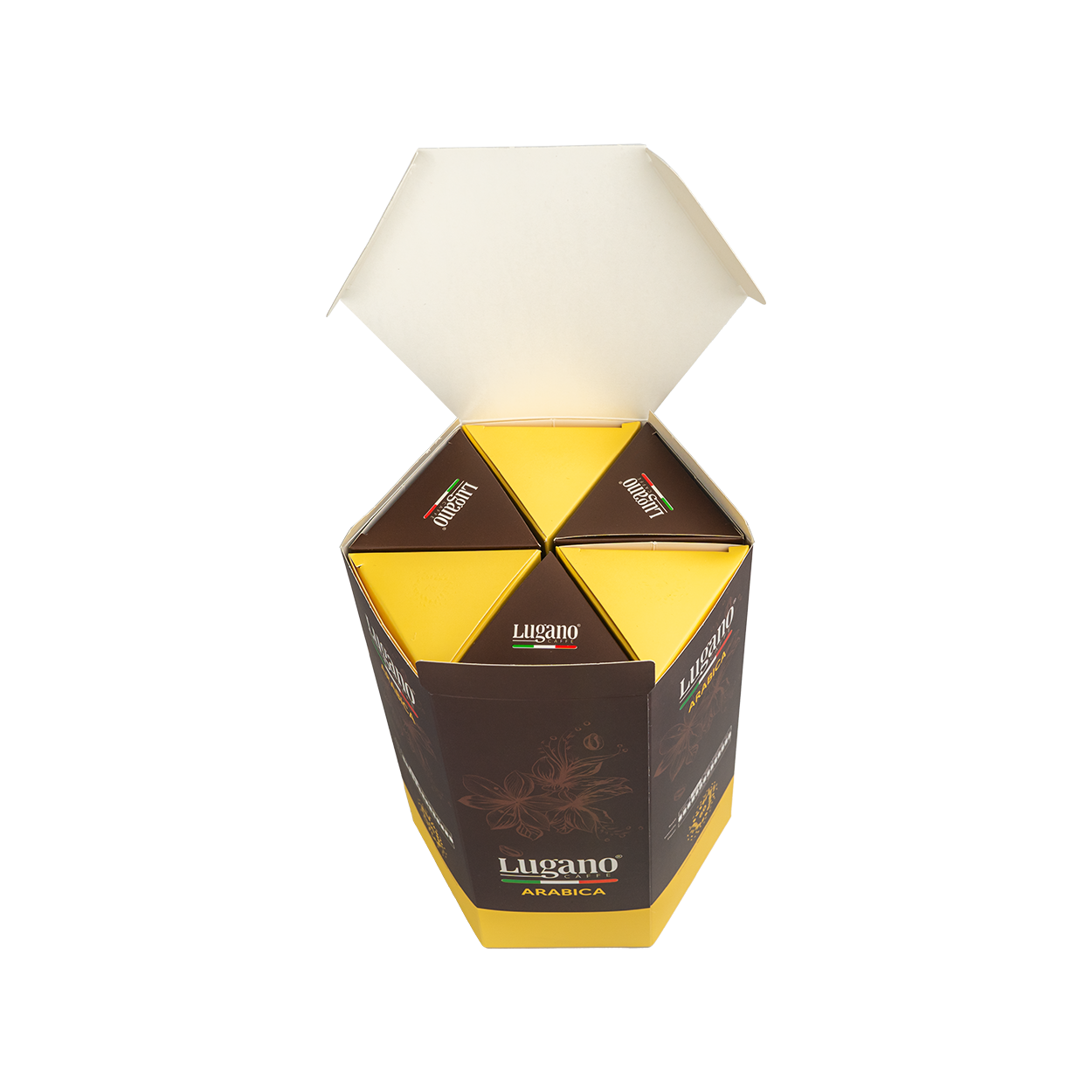 The product comes in a hexagonal pack of 60 capsules (6 triangular packs * 10 pcs. flushed with N-gaz technique). Capsule Net Weight: 5.5 gr /0.17 oz – Capsule Diameter: 3.6 cm. Capsule Materials: PP plastic sealed with an aluminum lid.