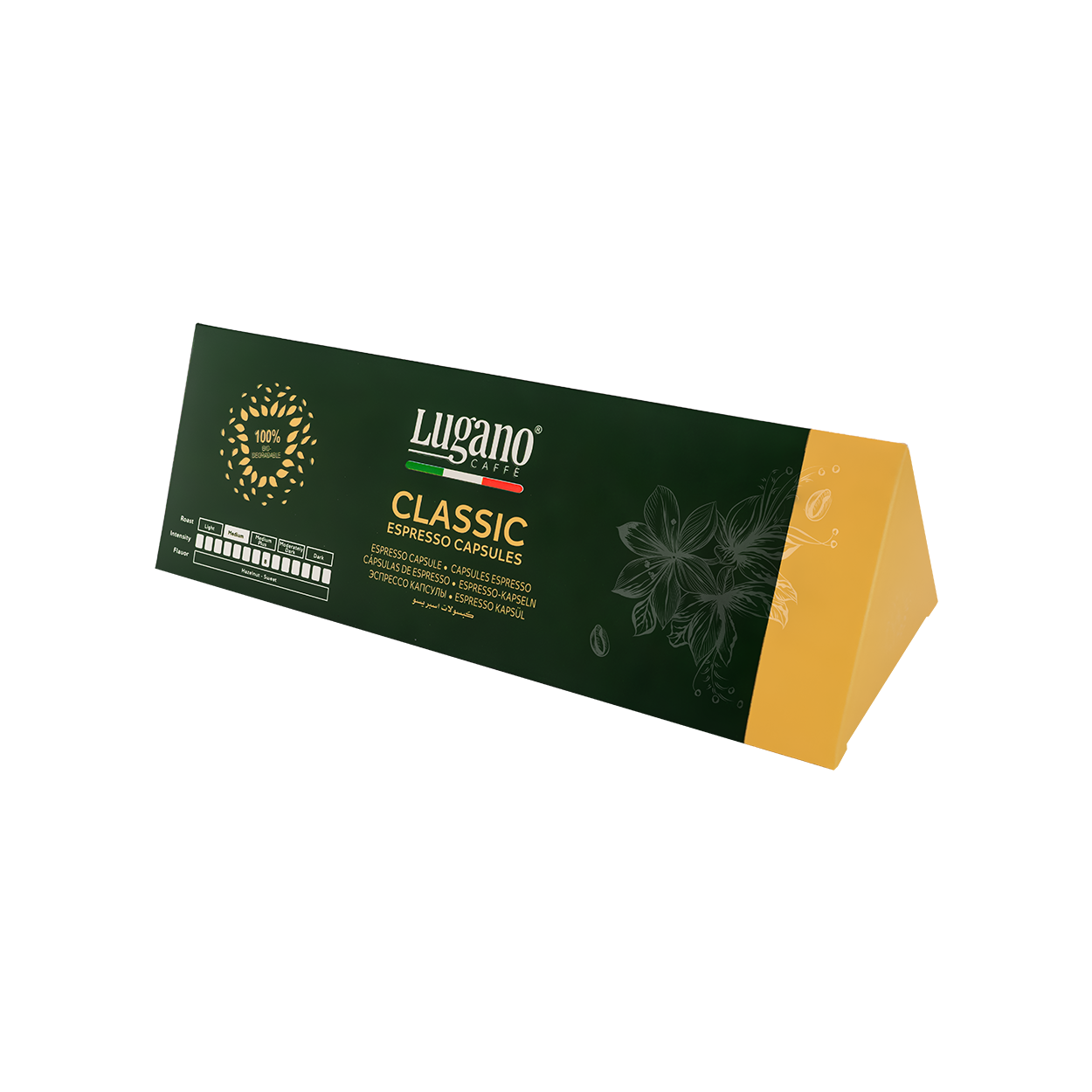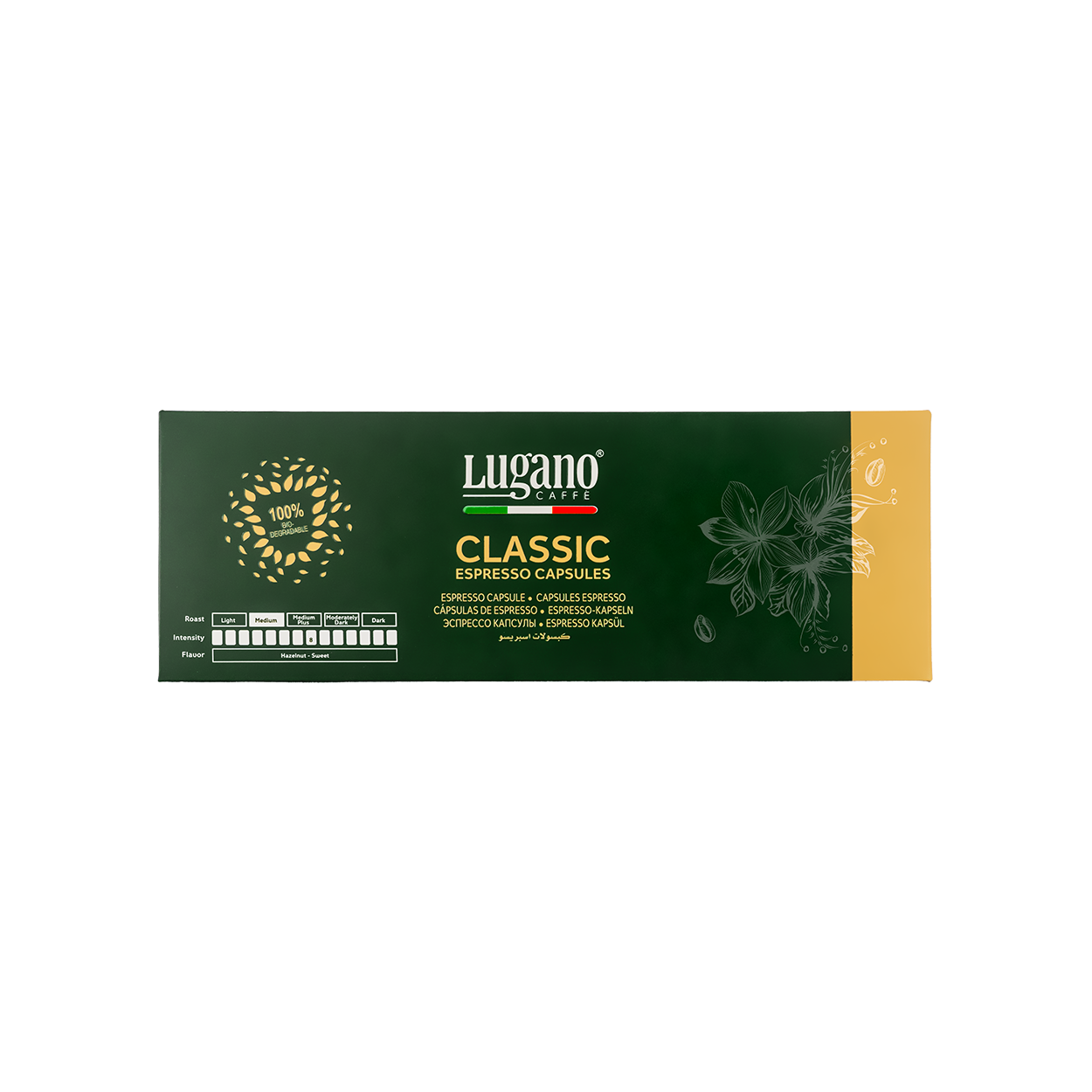 Lugano Caffè Classic Espresso Capsules have a balanced blend of high-quality Arabica and Robusta coffee beans. The classic capsule is distinguished by its attractive and strong aroma.